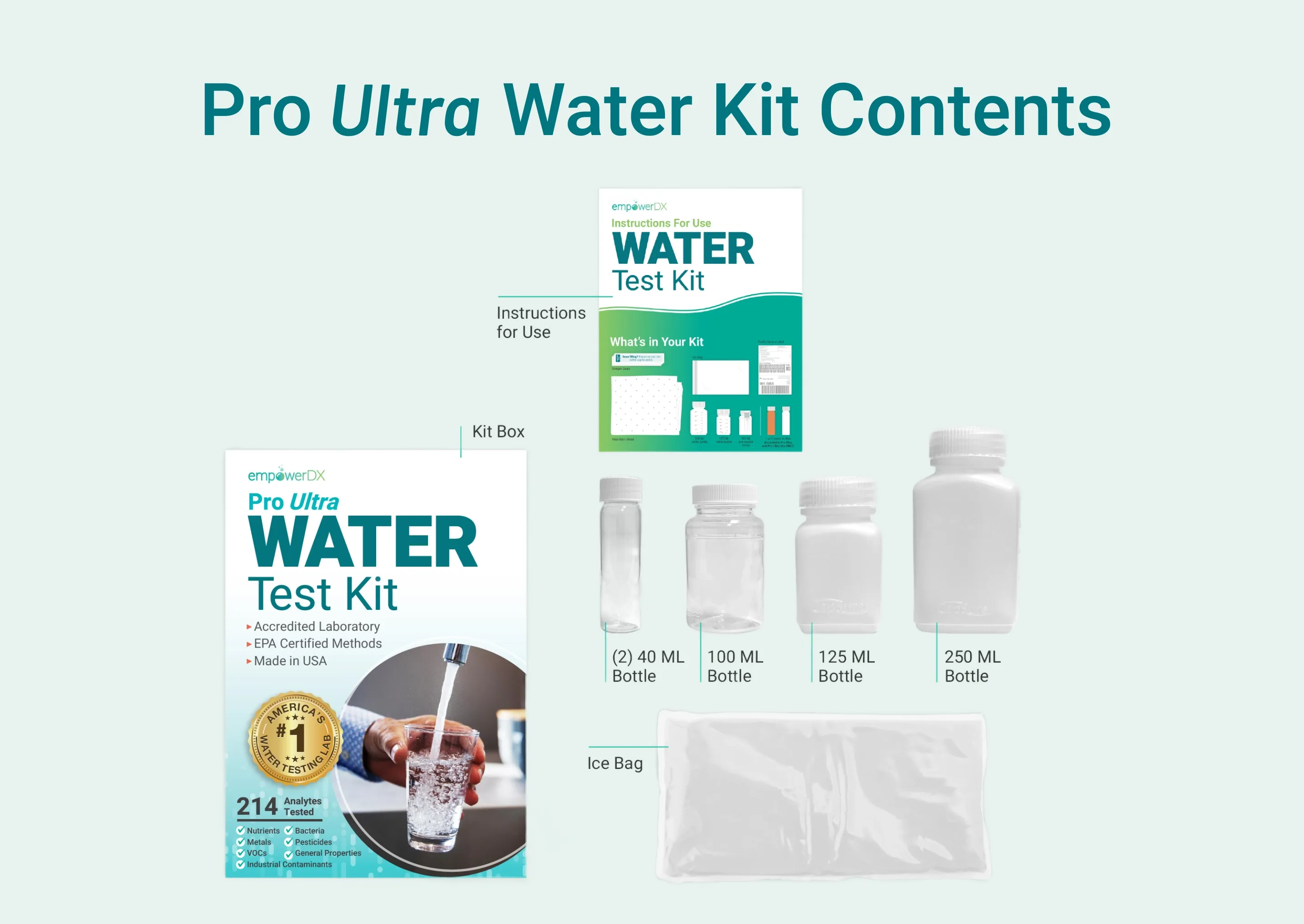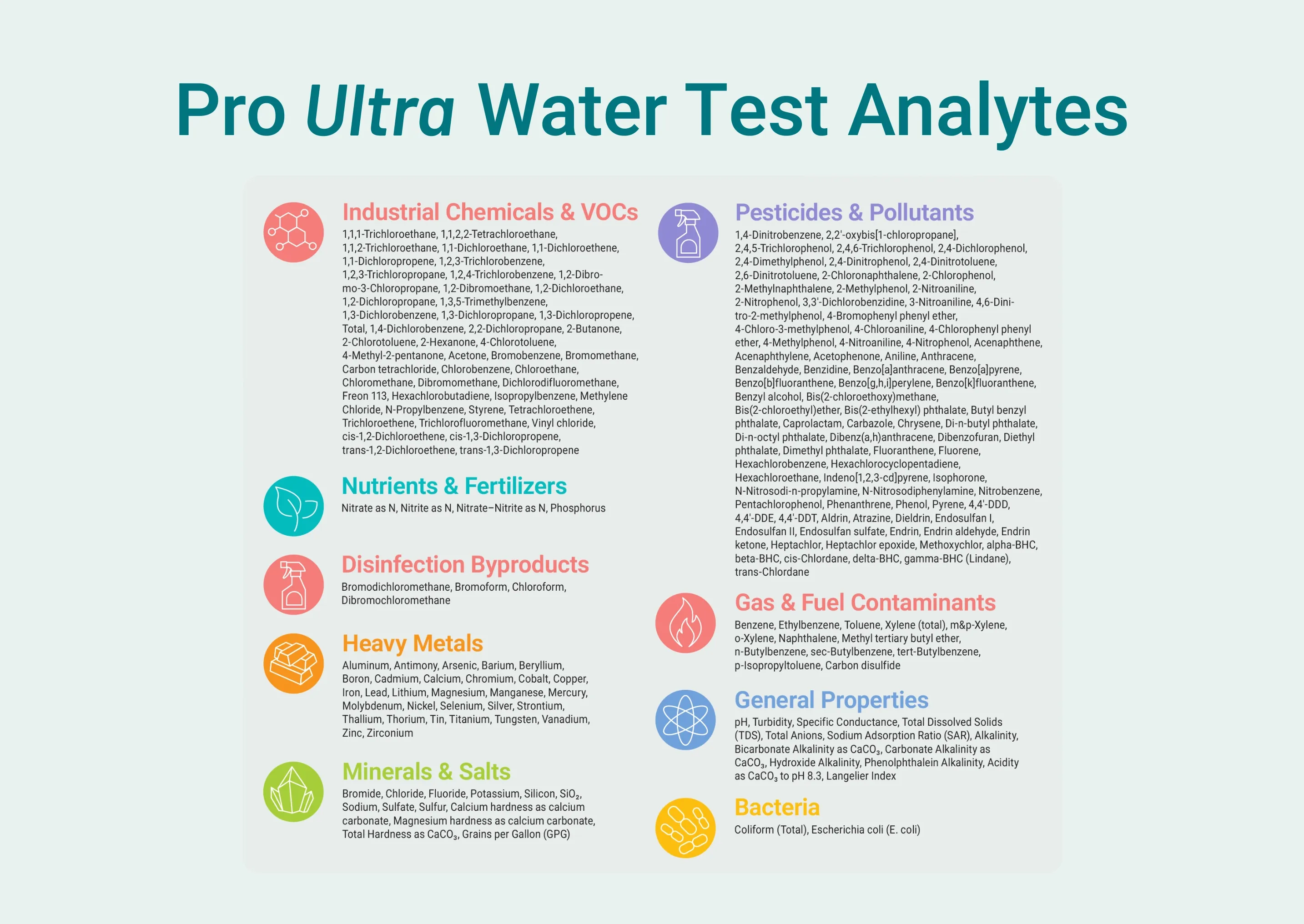 The Pro Ultra Kit takes everything in the Pro Plus Kit—minerals, metals, bacteria, VOCs, industrial chemicals, and more—and expands it to screen for semi-volatile organics, fuel contaminants, disinfection byproducts, and additional pesticides/herbicides, bringing your total coverage to 213 analytes. This is our most comprehensive at-home water test, designed for anyone who wants the fullest picture of what’s in their tap, city, well, filtered, or rainwater.