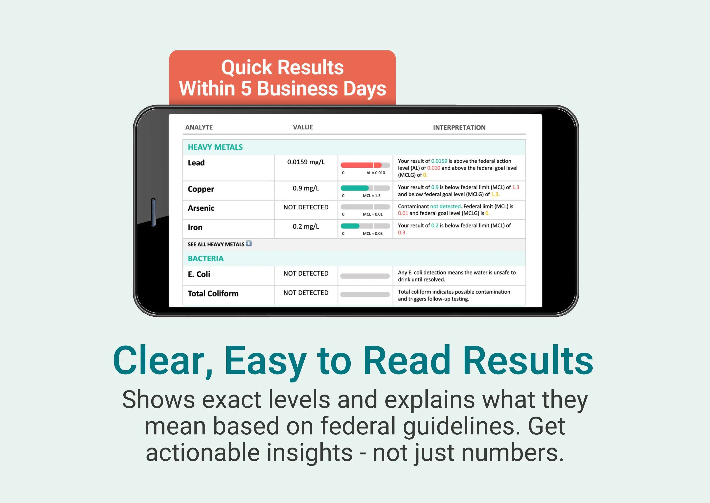 Collect your sample, ship it with prepaid postage, and get fast, verified results within days. Our detailed digital report interprets your results against federal guidelines, so you know exactly where your water stands. Every test is conducted in our U.S.-based lab, certified by the EPA and NELAP, ISO/IEC 17025 accredited, with over 30 years of water testing experience and more than one million tests performed—water testing you can trust.